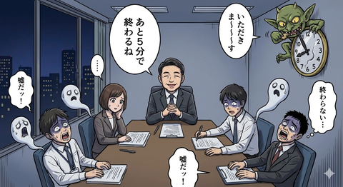 「オフィス怪談:「あと5分で終わるね」から30分続く、終わらない会議のタイムループを作成しました。 オフィスで起こる”あるある”な出来事の一つ···